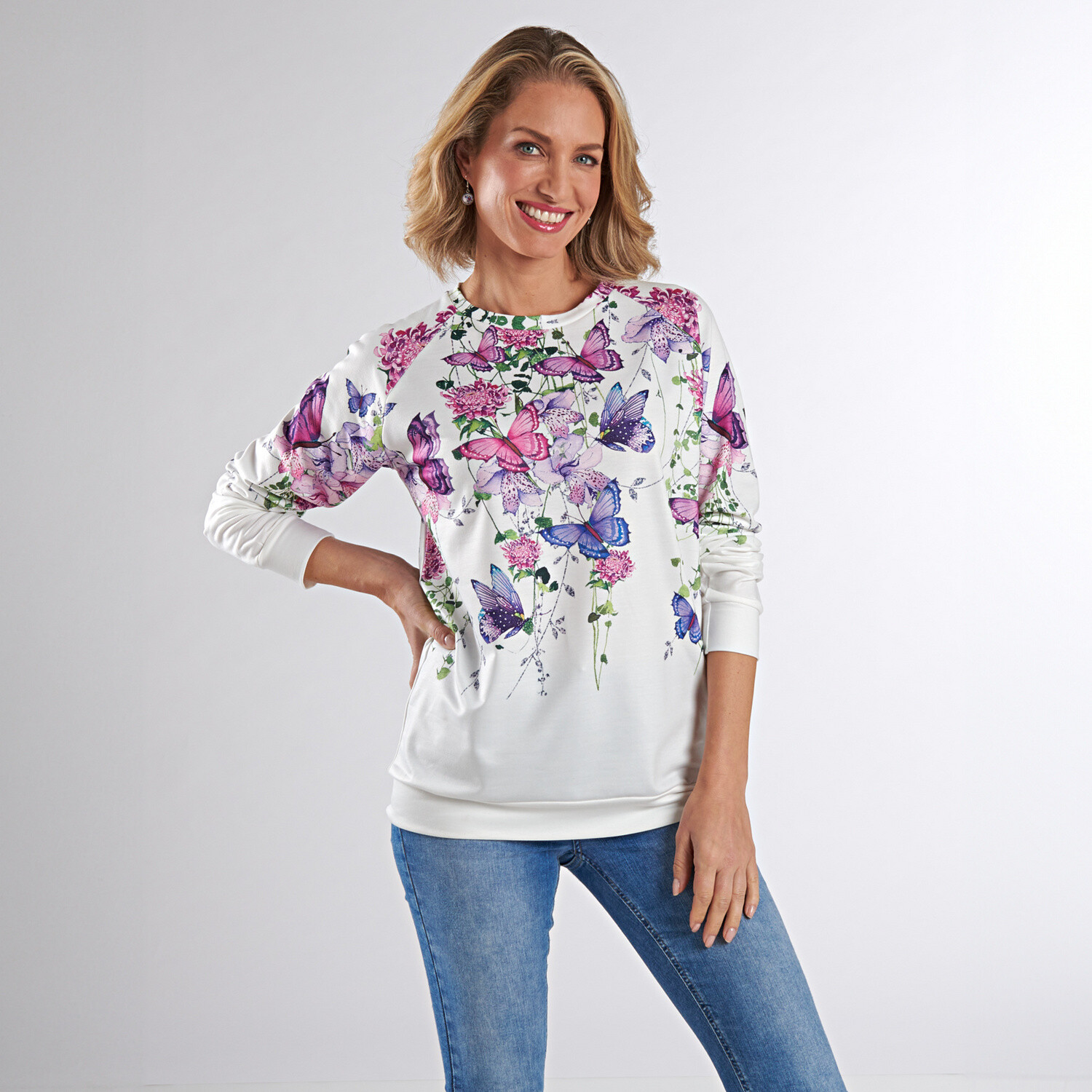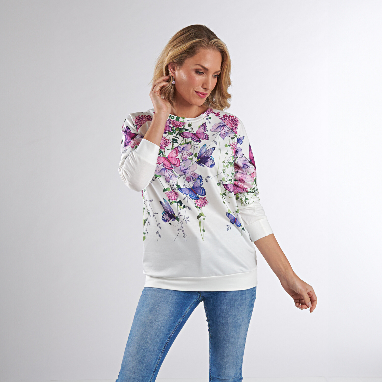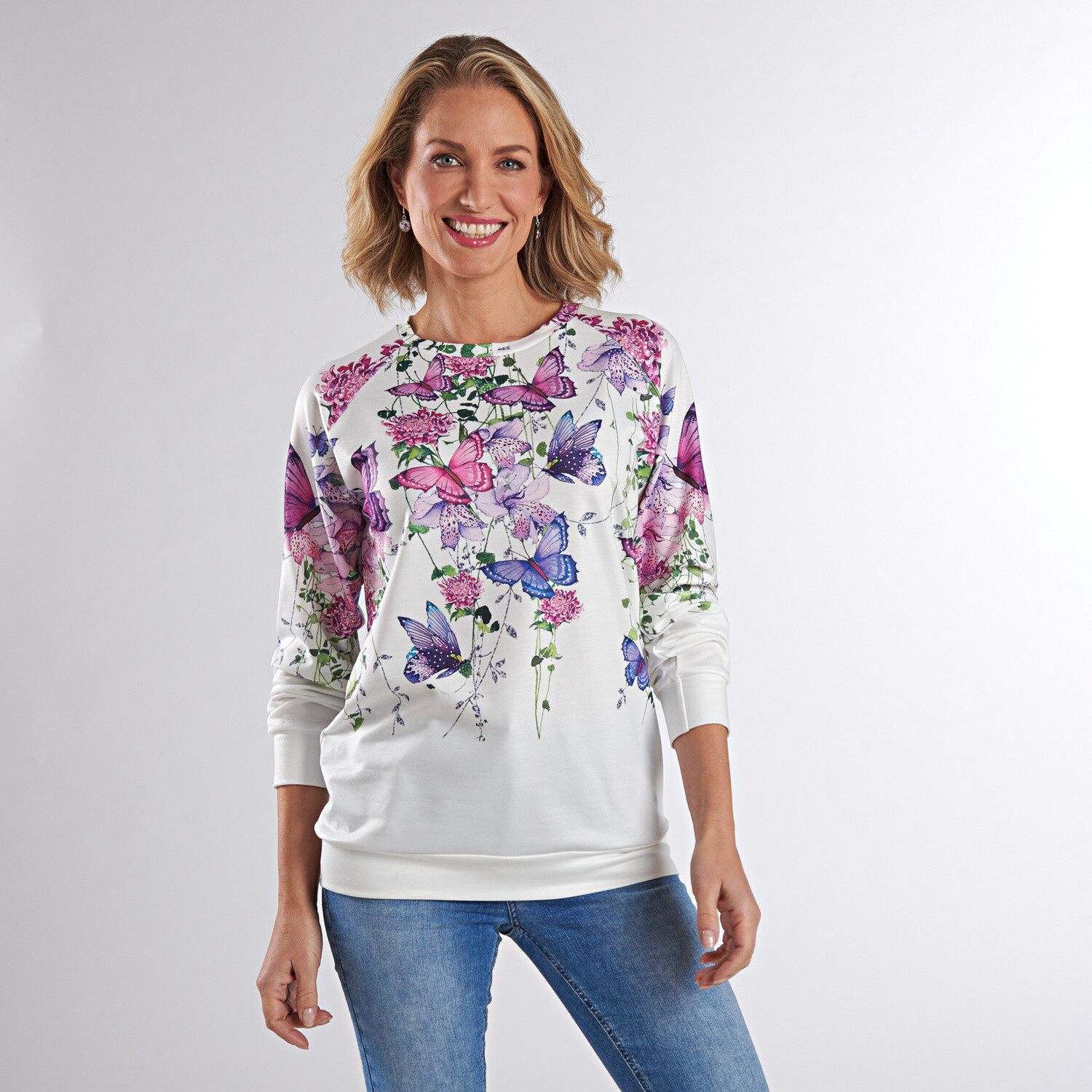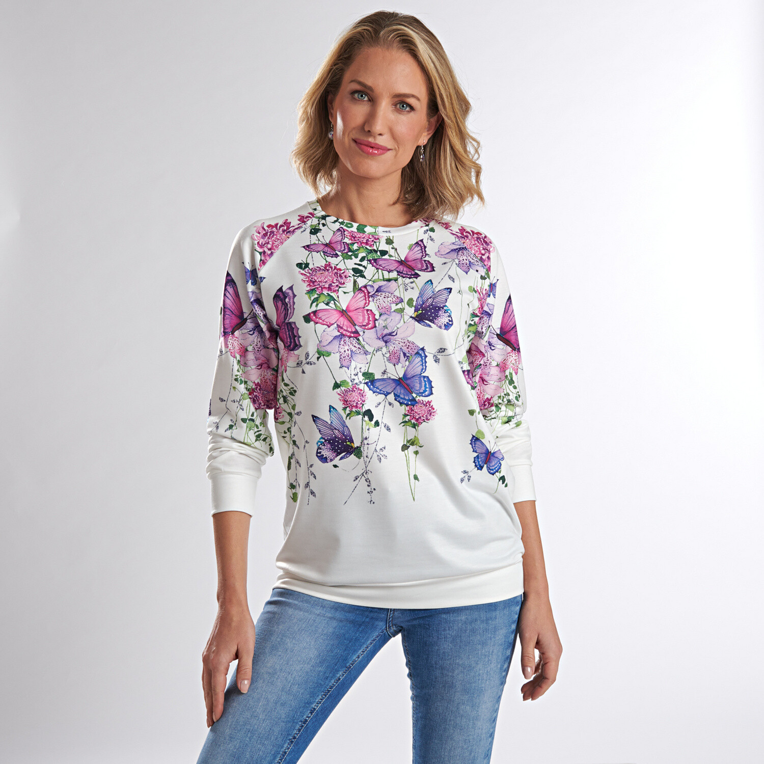 Zamilujte si toto okouzlující tričko s potiskem pastelových motýlů. Ležérní střih s raglánovými rukávy a manžetami - ideální na jaro! Tričko snů. Snadná údržba. Nadčasové.