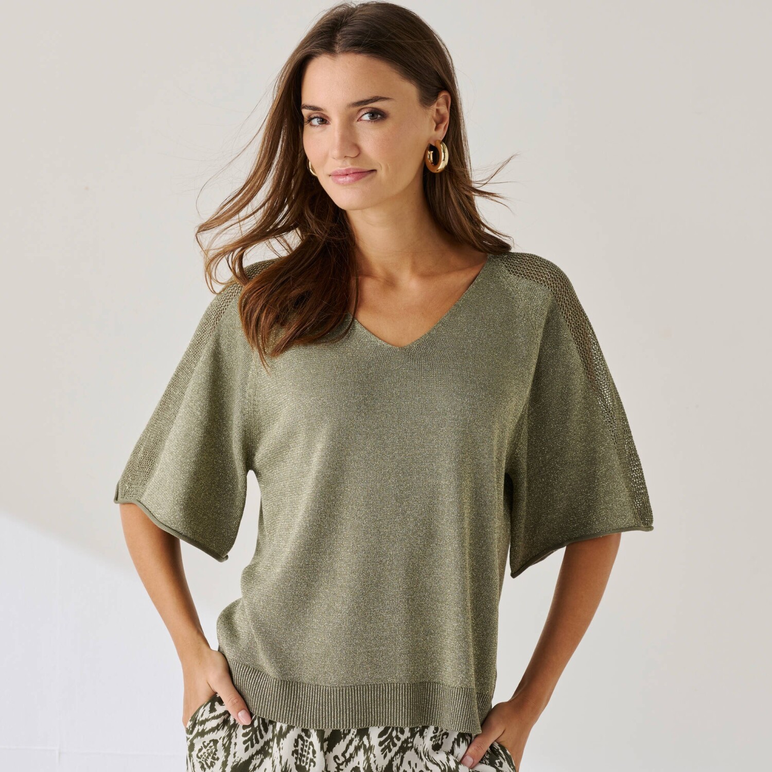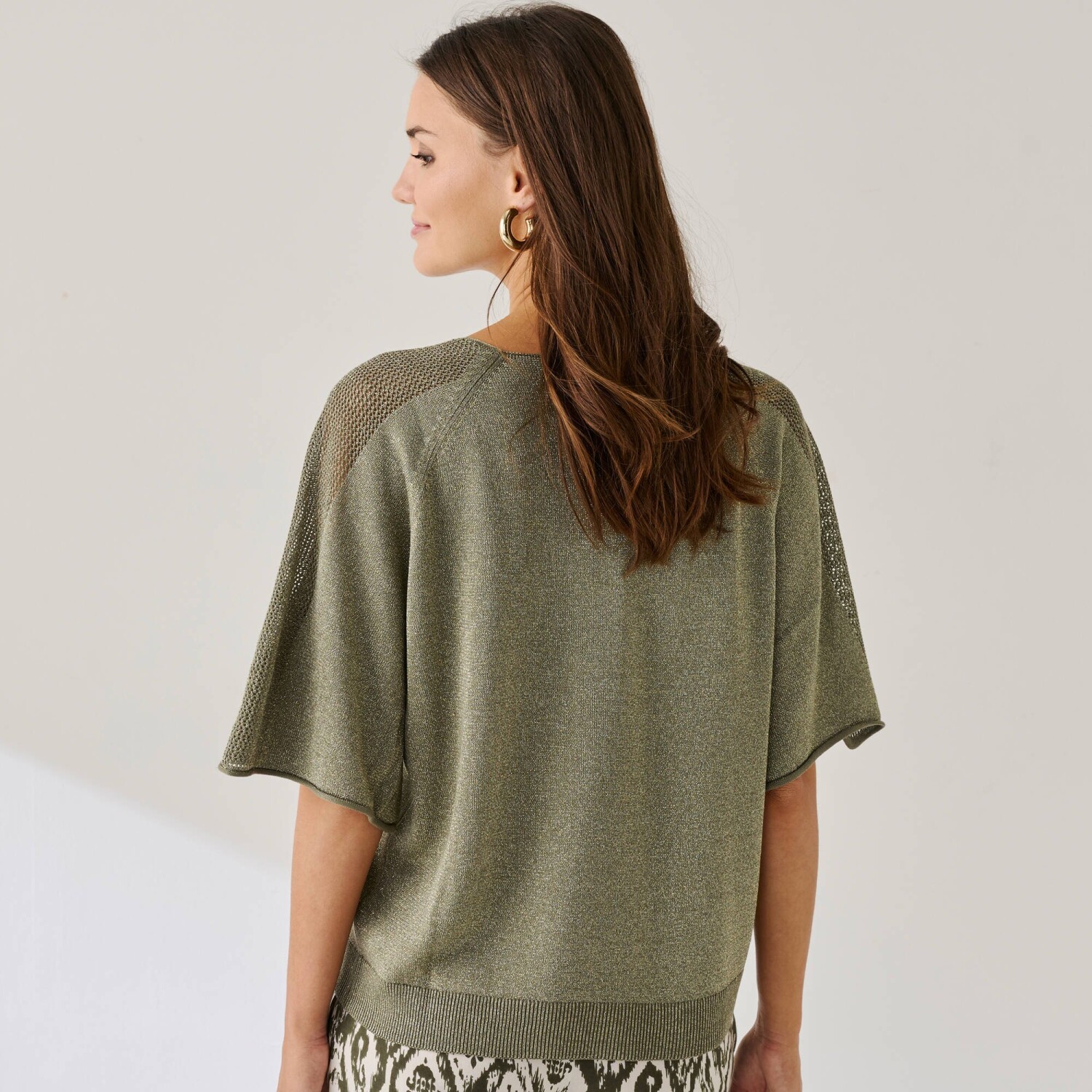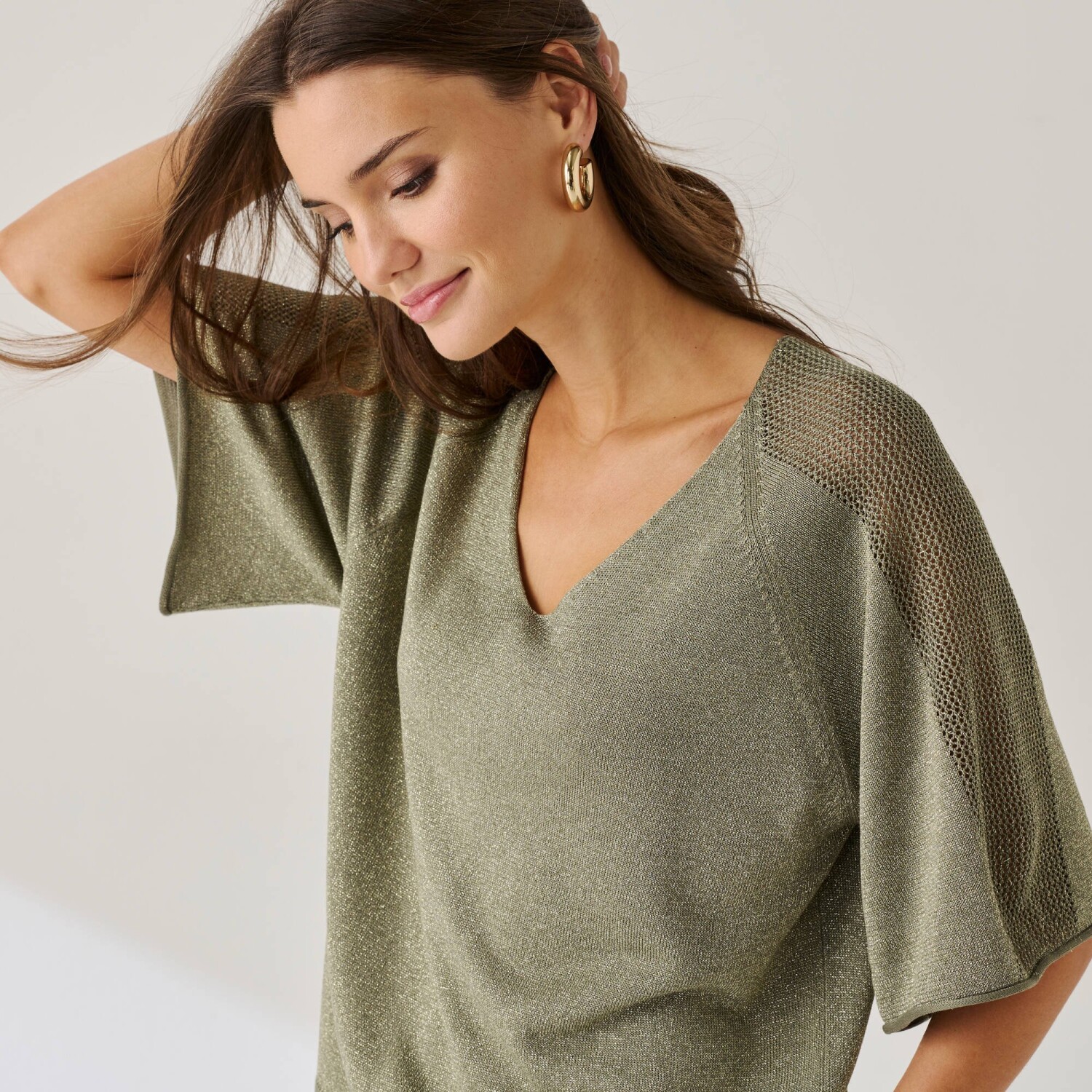 Sezónní úplet jemný na dotek, ažurové detaily a ženský look: módní pulovr si získá každé srdce. Ažurové pletené detaily na trupu a rukávech. Kulatý výstřih. Dlouhé halenkové rukávy zúžené žebrovanými manžetami. Spadlá ramena. Zúžený žebrovaný spodní lem. Lze prát v pračce.