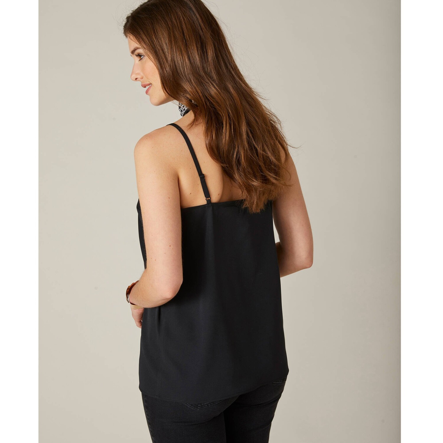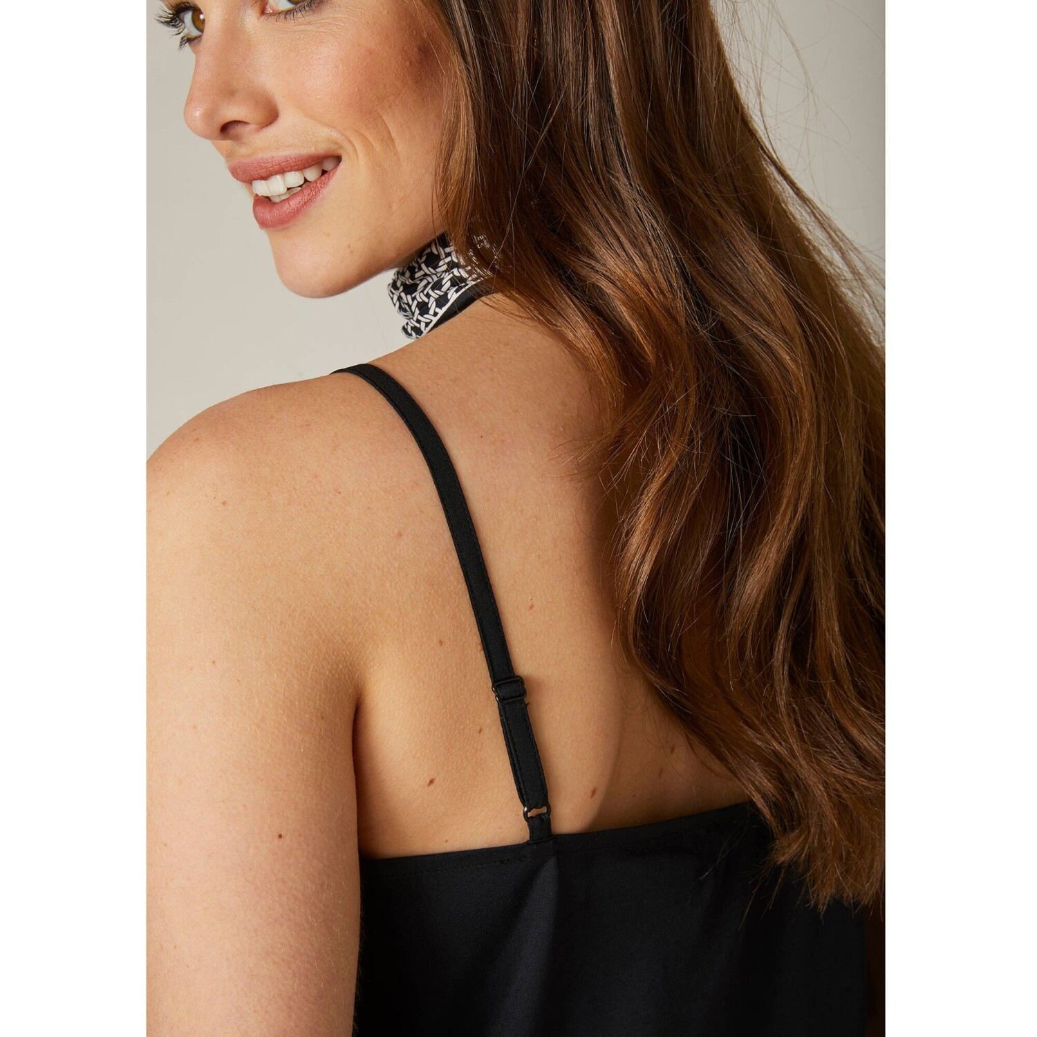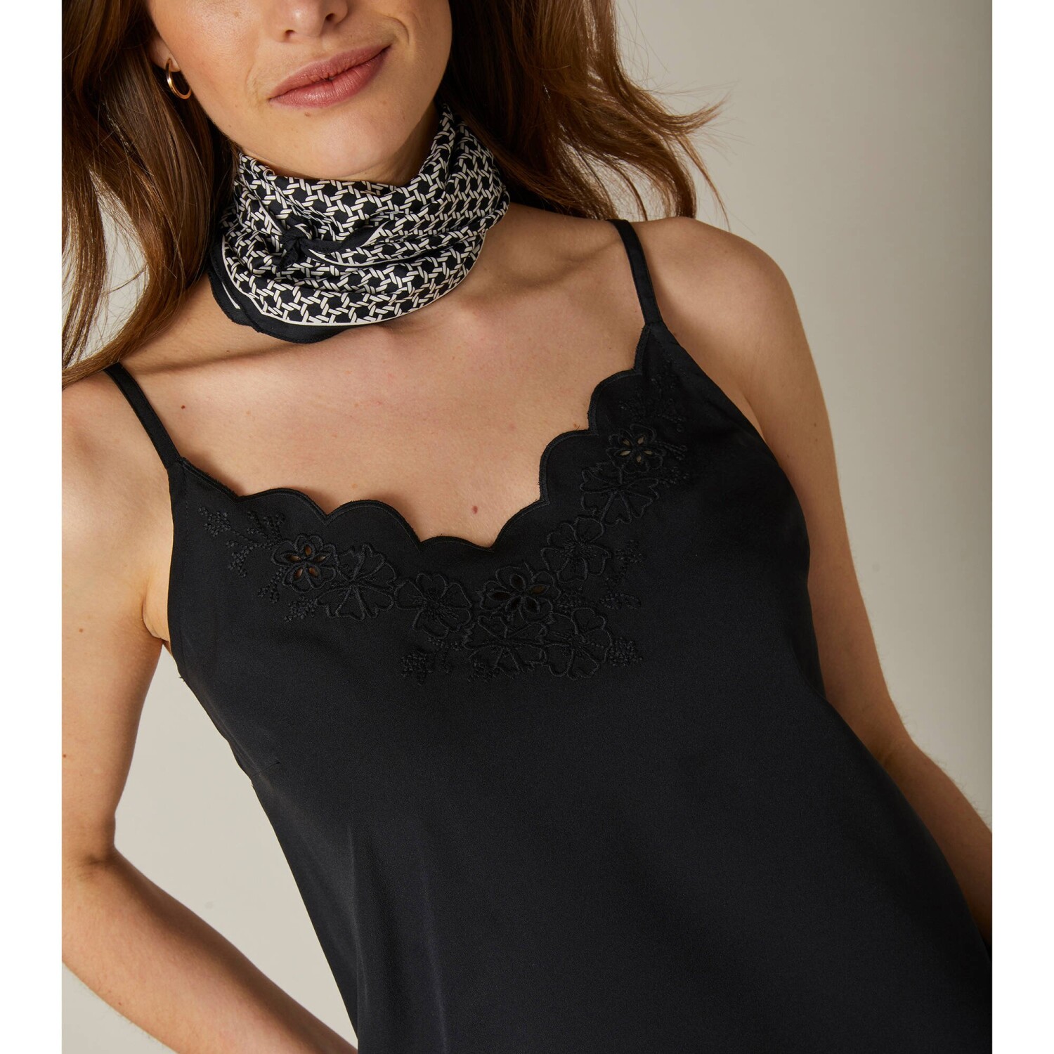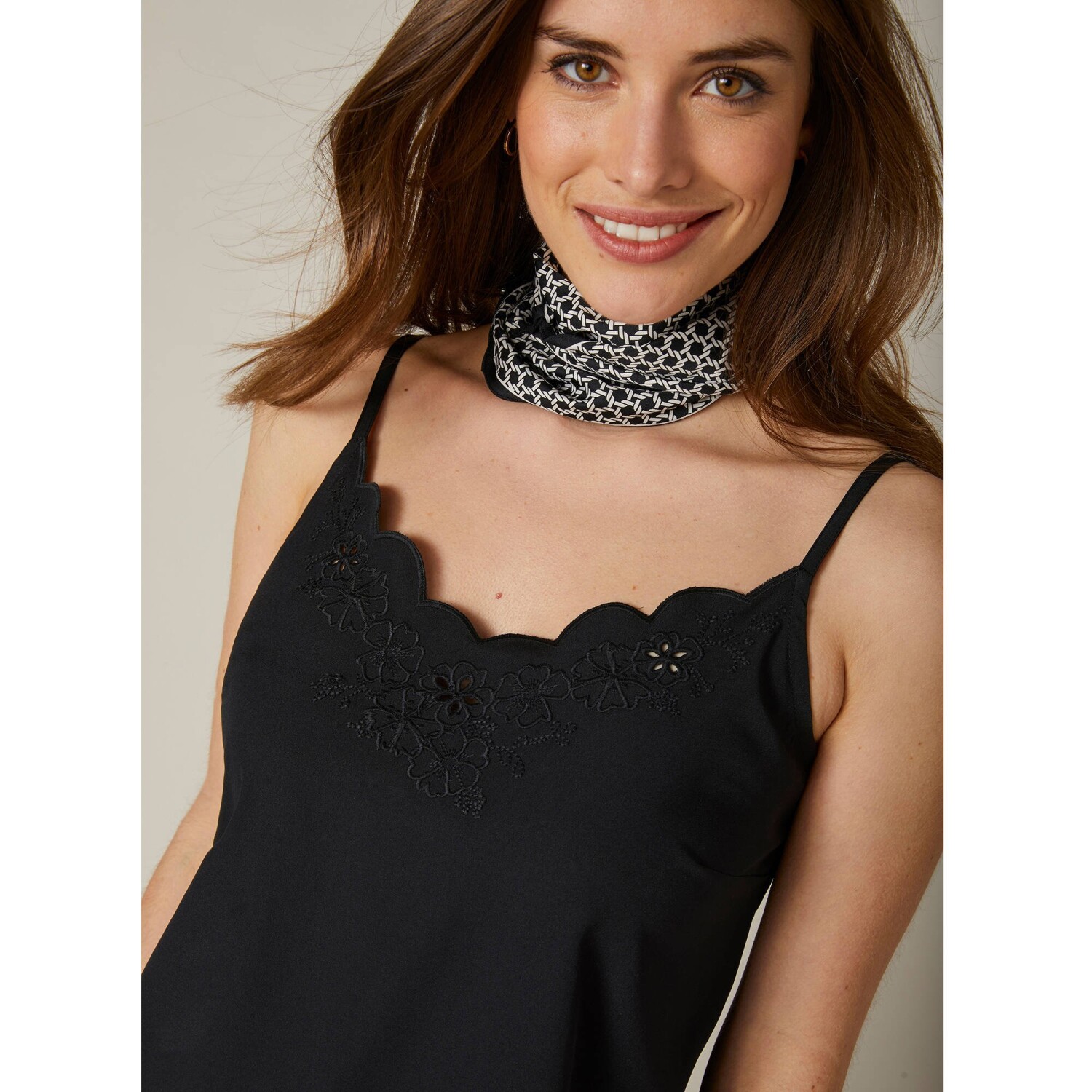 Rafinovaný top s ažurovou výšivkou je navržen ze vzdušného krepu. Vpředu rovný výstřih s výšivkou s vlnkovaným zakončením tón v tónu. Vzadu rovný výstřih. Úzká nastavitelná ramínka. Prsní záševky. Rovný spodní lem. Lze prát v pračce.