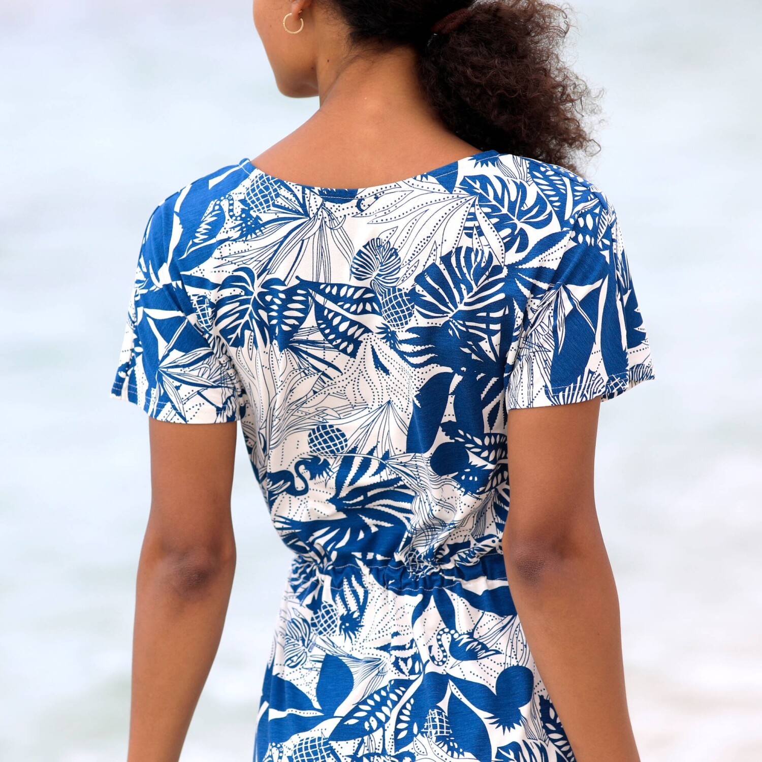 Šaty s tropickým vzorem umí lichotit ženské postavě. S macramé náprsenkou a volánky! Z lehké viskózy příjemné na nošení. Stylový potisk tropického vzoru. Kulatý nařasený výstřih s macramé náprsenkou. Volánové krátké rukávy. Rozšířený střih vhodný pro každou postavu. Lze prát v pračce.
