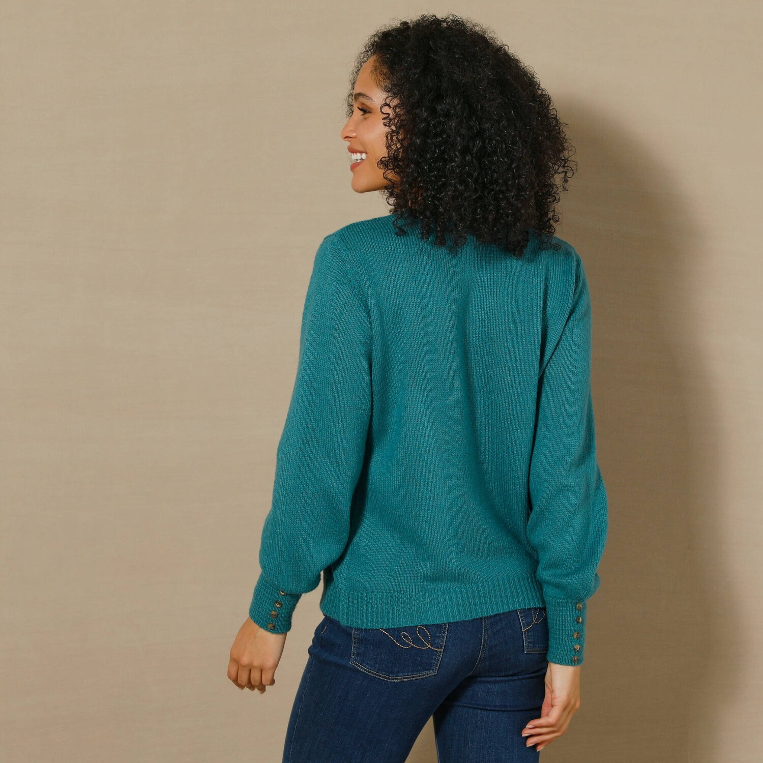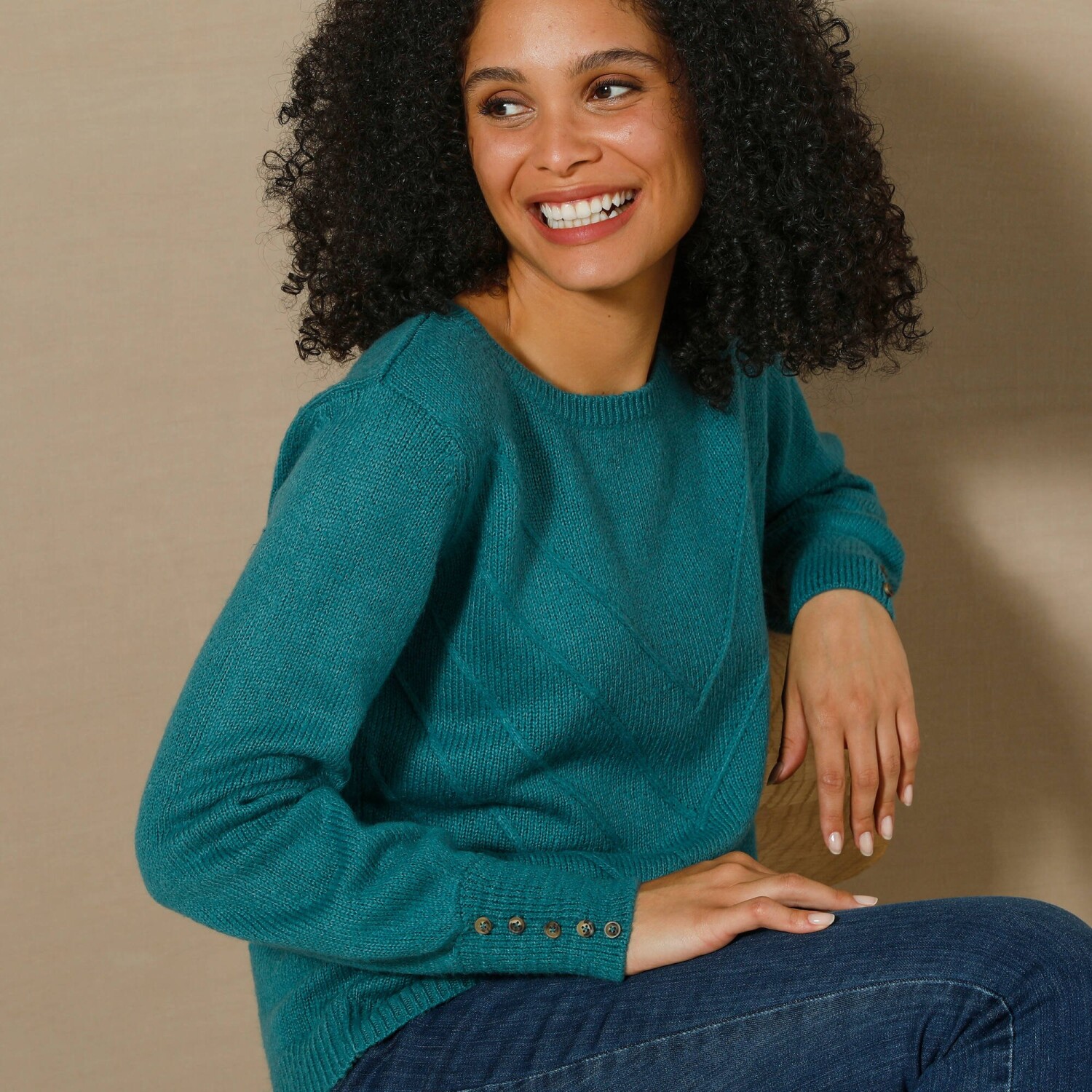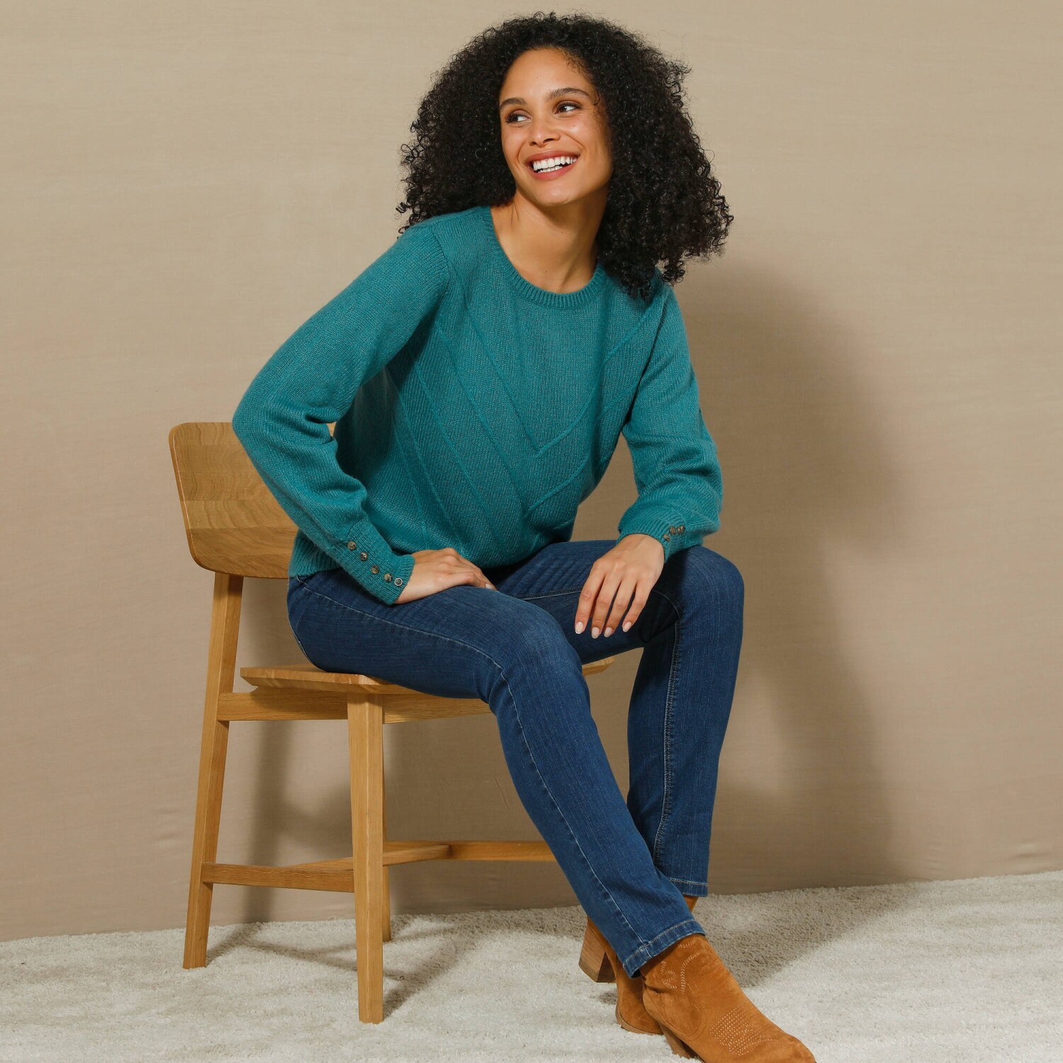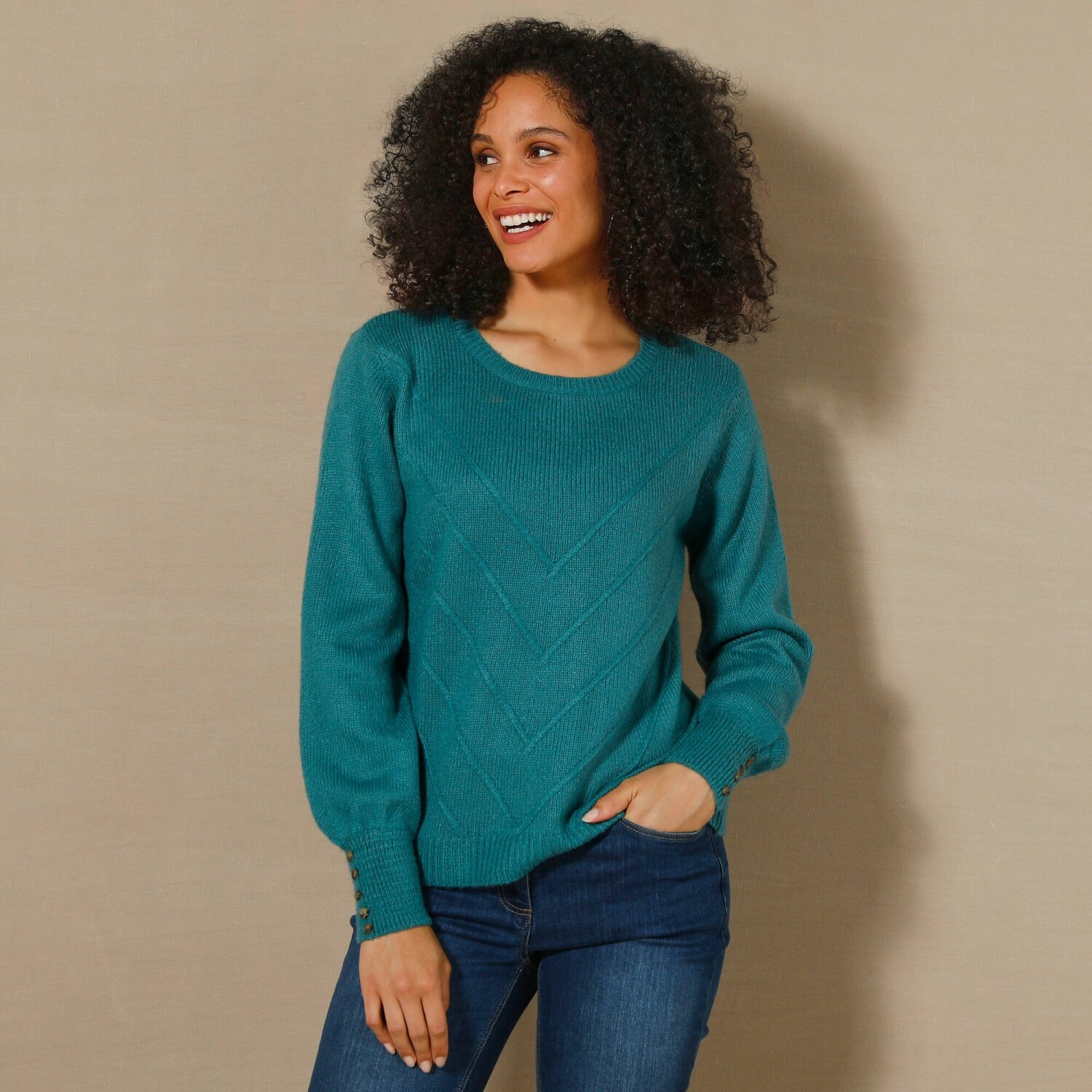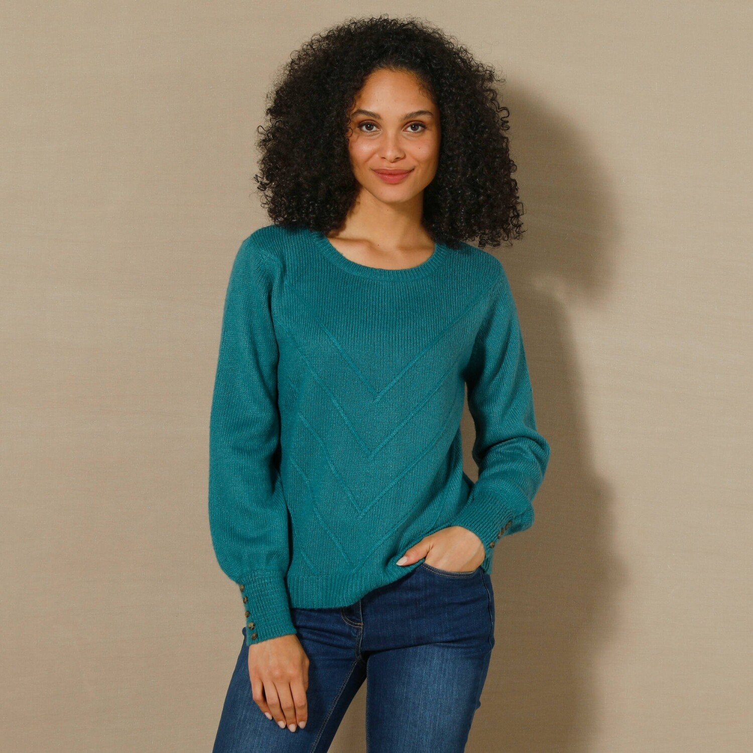 Nařasená ramena, jemný odstín, glamour ažurový vzor - tento pulovr ví, jak si nás získat! Ženský ažurový vzor. Dlouhé rukávy s nařasením v ramenou. Ažurový grafický design vpředu a uprostřed rukávů. Pružné zakončení. Rovný spodní lem. Lze prát v pračce.